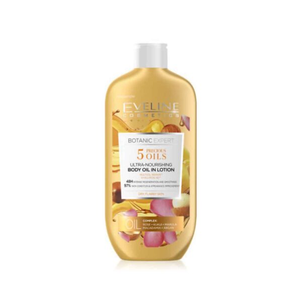 Indulge your skin with Eveline Botanic Expert 5 Precious Oils Body Oil in Lotion Ultra-Nourishing 350ml, a luxurious formula designed to provide intense hydration and nourishment. This unique blend combines the benefits of 5 precious oils to keep your skin soft, smooth, and radiant. The lightweight lotion absorbs quickly, leaving no greasy residue, making it perfect for daily use. Pamper yourself with this ultra-nourishing body oil in lotion for a truly rejuvenating experience.